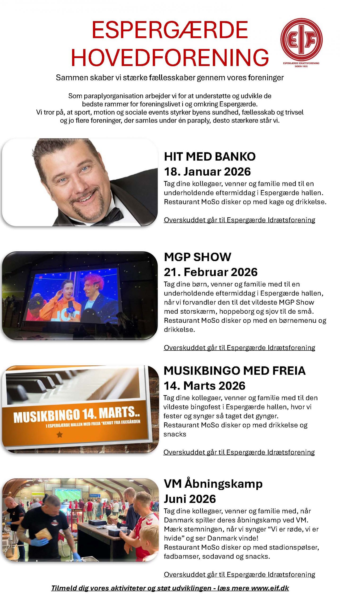 Foreningen står for en række arrangementer i foråret 2026 - fra banko og MGP show til musikbingo og VM Åbningskamp. Læs mere her.